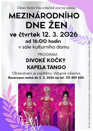 Obec Kunín Vás srdečně zve na oslavu Mezinárodního dne žen, která se uskuteční ve čtvrtek 12. března 2026 od 16:00 hodin v sále kulturního domu v Kuníně. O zábavu se postarají Divoké kočky a kapela Tango. Vstupné zdarma. Rezervace nutná do 3. 3. 2026 na tel. 721 459 505.