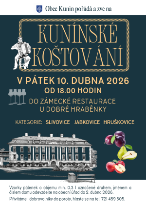 Obec Kunín Vás srdečně zve na tradiční Kunínské koštování, které se uskuteční v pátek 10. dubna 2026 od 18:00 hodin v zámecké restauraci U Dobré hraběnky. Vzorky pálenek o min. objemu 0,3 l označené druhem, jménem a číslem domu, odevzdejte na OÚ nejpozději do 2. dubna 2026.