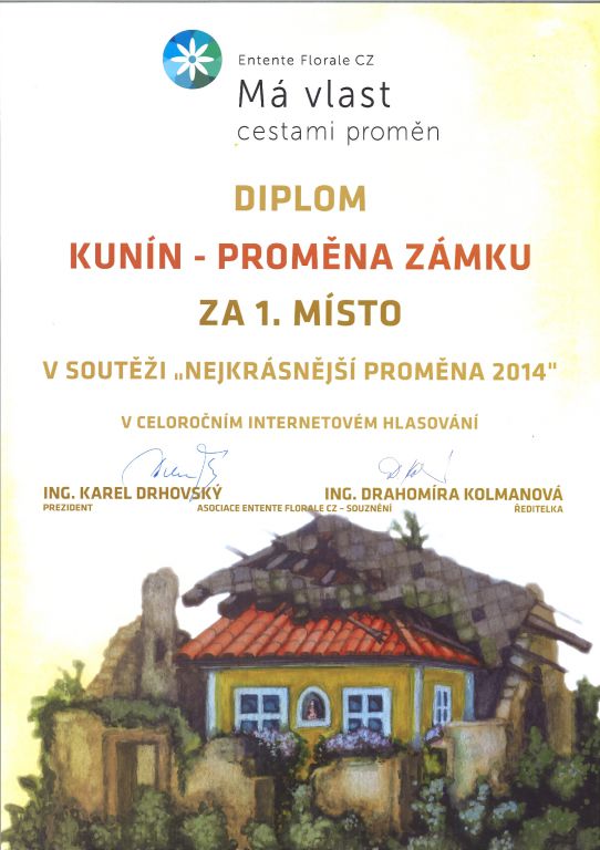Přihlásili jsme zámek Kunín do projektu Má vlast cestami proměn. Tato putovní výstava přináší svědectví o zvelebování opomíjených míst a objektů v sídlech a krajině, o proměnách chátrajících staveb v důstojné objekty s užitečnou náplní, o zkrášlených náměstích a návsích, o rekonstruovaných nádražích, zachráněných sakrálních stavbách a znovuoživené přírodě.