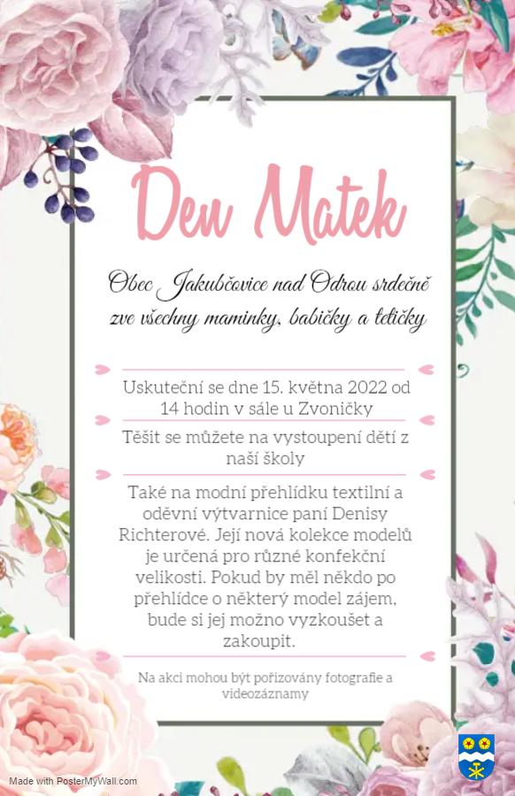 Obec Jakubčovice n/O společně se SPOZ Jakubčovice zve všechny maminky, babičky i tetičky na oslavu Dne Matek v neděli 15. května 2022 od 14:00 hod v sále Hospody U Zvoničky. Občerstvení zajištěno. Na programu je vystoupení dětí z naší školy a módní přehlídka výtvarnice paní Denisy Richterové.