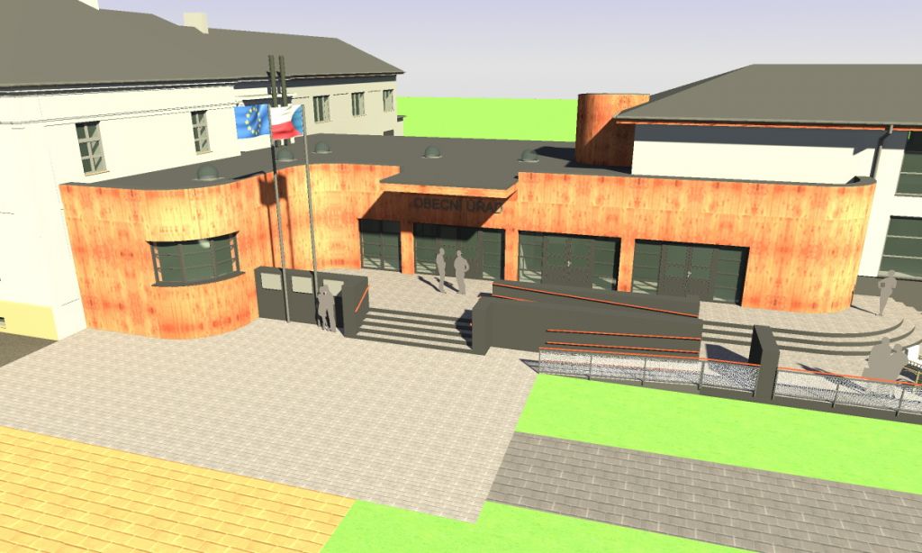Zregeneruje se stávající terasa před vstupem do bývalého kina (nově tedy do obecního úřadu a obecního sálu) a vytvoří tak reprezentativní vyvýšenou vstupní podestu. Tato terasa bude doplněna rampami pro bezbariérový přístup.