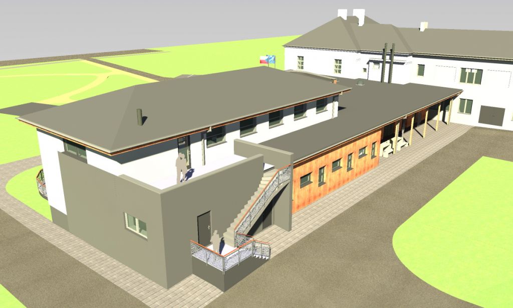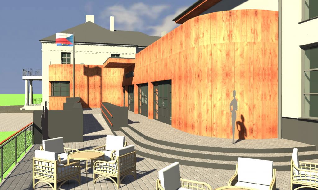 Co se týče architektonického řešení, budou ponechány stávající vyvýšené hmoty obecního úřadu a bývalého kina, které budou i nadále omítnuty světle zbarvenou omítkou. Snížený organicky řešený vstupní objekt bude opatřen ze strany vstupu vyvýšenou atikou a bude obložen dřevěným vertikálním obložením. Valbová střecha bude nahrazena pultovou s mírným sklonem k výletišti a bude doplněna střešními světlovody, které prosvětlí vnitřní prostory vestibulu a toalet.