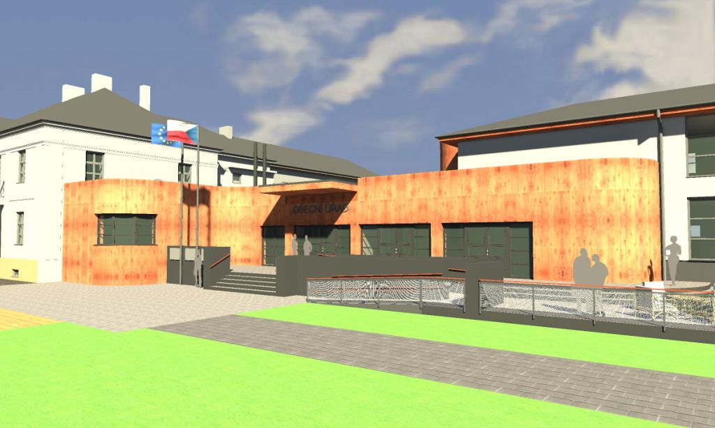Hlavní koncepce návrhu spočívá v důsledném a přiznaném propojení obecního úřadu a bývalého kina – nově obecního sálu. Bude vytvořen jeden centrální bezbariérový vstup, který bude jasně patrný a reprezentativní, ze kterého bude možno pokračovat jednak do obecního úřadu a také do nového prostoru vestibulu a sálu. Tento vstup bude umístěn v místě stávajícího vstupu do kina, tedy do nižší hmoty mezi bývalé kino a stávající obecní úřad. Tato hmota, která se dnes z východní strany ke kinu přimyká pomocí oblouku, bude pokračovat ve formě přístavby, která se obdobně obloukovitě přimkne ke stávajícímu obecnímu úřadu a vznikne tak prostor pro umístění pošty.